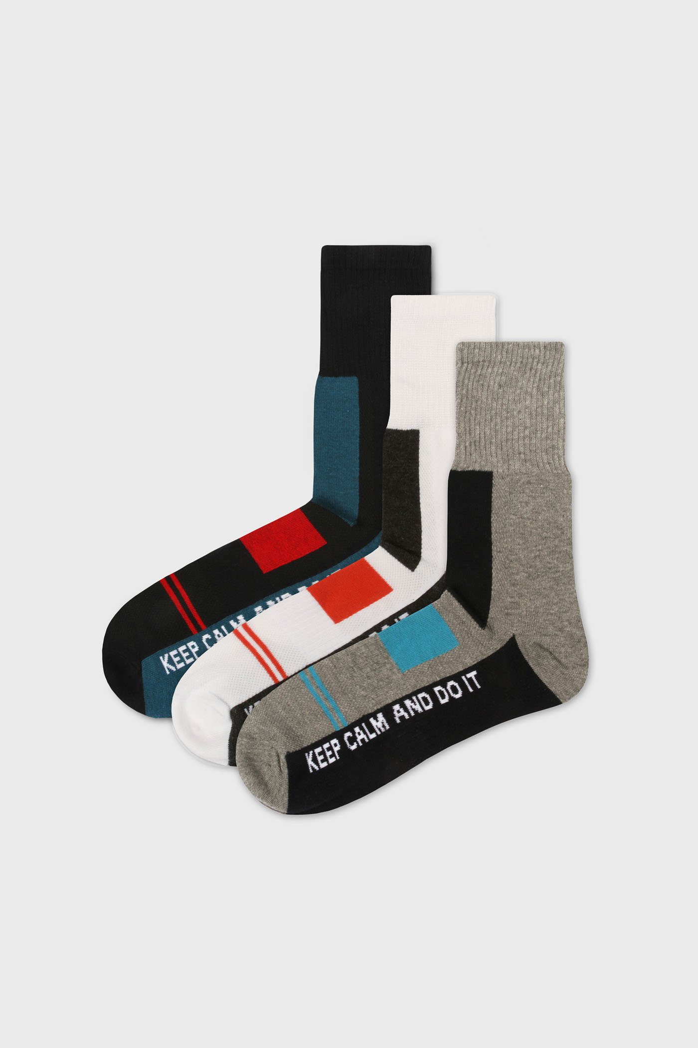 Keep calm férfi magaszokni praktikus hármas csomagolásban. A magas pamuttartalomnak köszönhetően rendkívül kényelmes a lábon.
