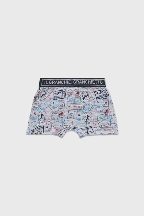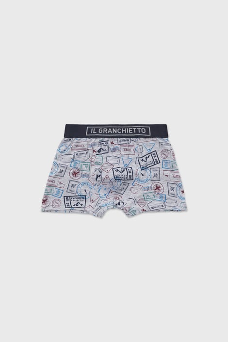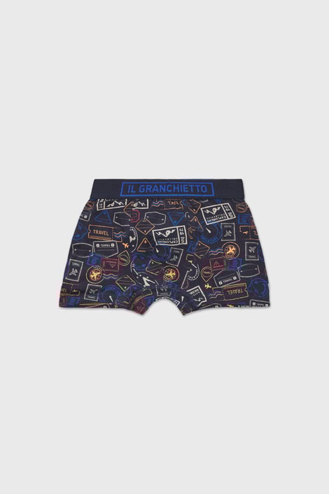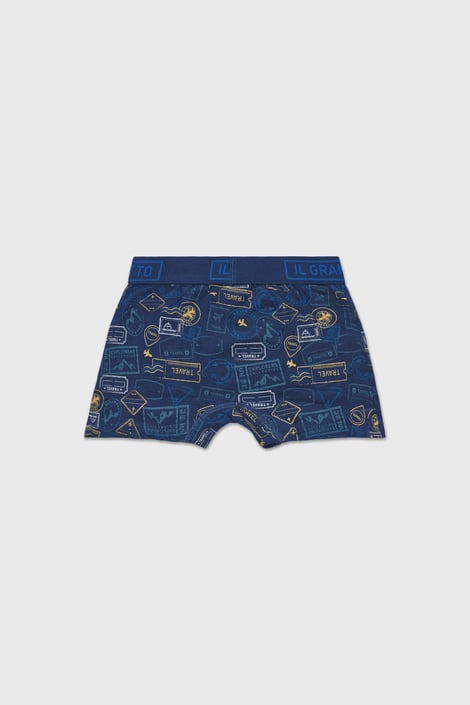 Pamut fiú boxeralsó utazási motívumokkal, gazdaságos csomagban. Derékban a gyártó logójával díszített széles elasztikus gumival.