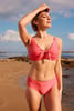 Az Aloha bikini kiváló választás a vízparti nyári romantikához. A bikinifelső bélés nélküli kosarakkal készült, melyek szabásának köszönhetően nagyobb keblekhez is alkalmazkodnak. Keblek között dekoratív megkötőkkel. Klasszikus szabású bikinialsó.