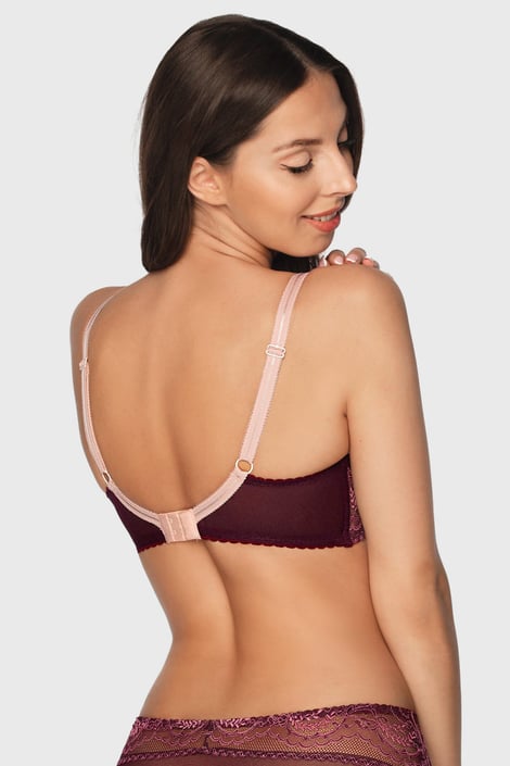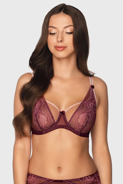 Az Asteria Bordo melltartó finom virágmintás csipkébe öltözteti kebleidet. A bélés nélküli kosarak belső oldala púder színű, kellemes puha tüllből készült. Nem csak a dús keblekkel büszkélkedő hölgyeknek ajánljuk.