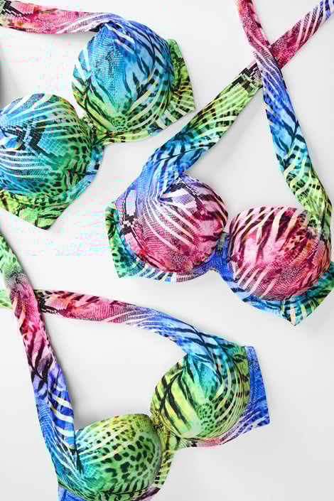 Cancun II bikini, sokszínű állatmintás dizájnban. A Push-Up hatású, gél betétekkel készült kosarak diszkrét és természetes módon formálják a melleket, ezért strandon és medence mellett is élvezheted a telt dekoltázst. A klasszikus szabású bikinialsó minden testalkatnak jól áll.
