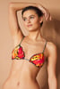 Sofia bikinifelső, absztrakt dizájnban. A háromszög alakú, puha betétekkel készült kosarak könnyen alkalmazkodnak kisebb és nagyobb keblekhez is. A kosarak apró fodorral szegélyezettek.