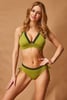 David Tulip bikini a limezöld színárnyalat és csillogó részletek kombinációjában. A puha betétekkel rendelkező, háromszög alakú kosarak természetesen telt dekoltázst varázsolnak, melyet mutatós fekete-aranyszínű részlet keretezi be. A klasszikus szabású bikinialsó a csípőrészén lévő húzózsinórok segítségével könnyen szabályozható.