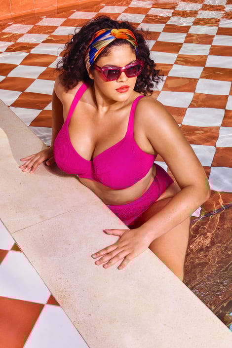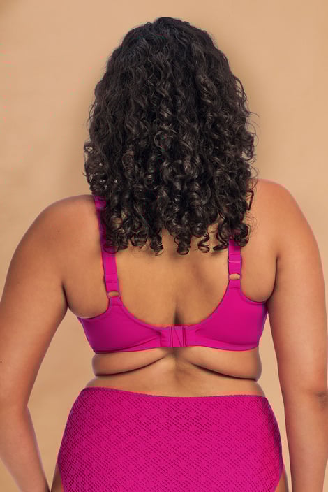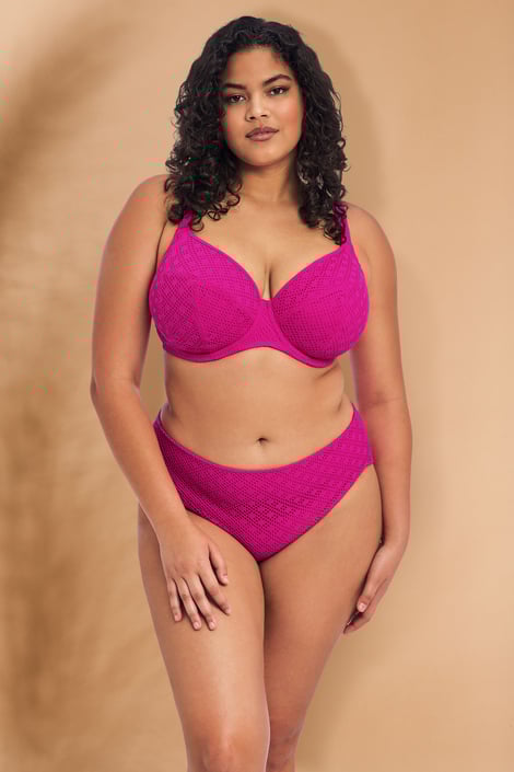Elomi Bazaruto bikinifelső olyan kivitelben, amely tökéletesen illeszkedik a dús keblekhez. A mérsékelten bélelt kosarak elegendően mélyek, ezért valóban nagy keblekhez is jó választás. A bedolgozott merevítők megfelelő támaszt nyújtanak, a magasabb középrész megfelelő tartást ad. Finom madeira mintával.