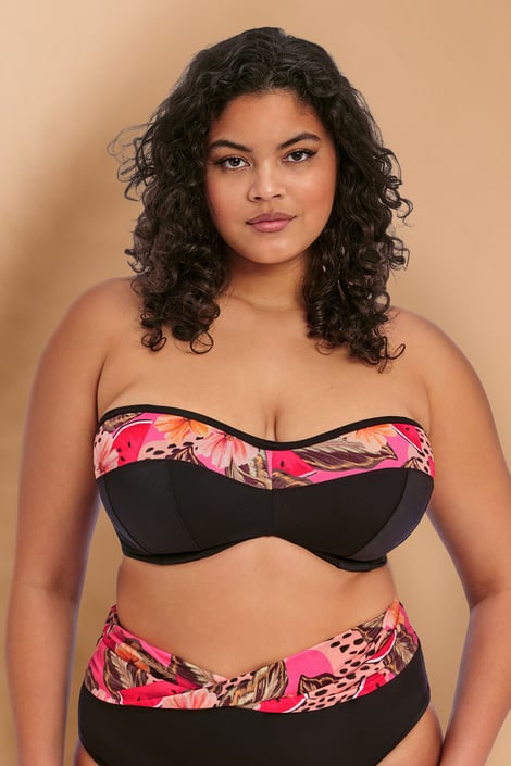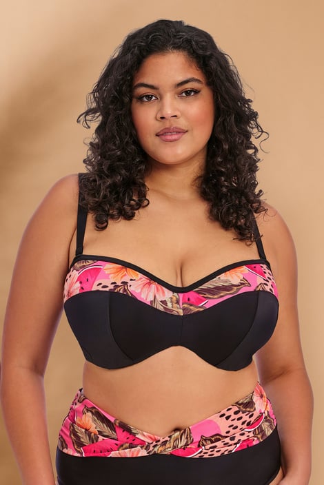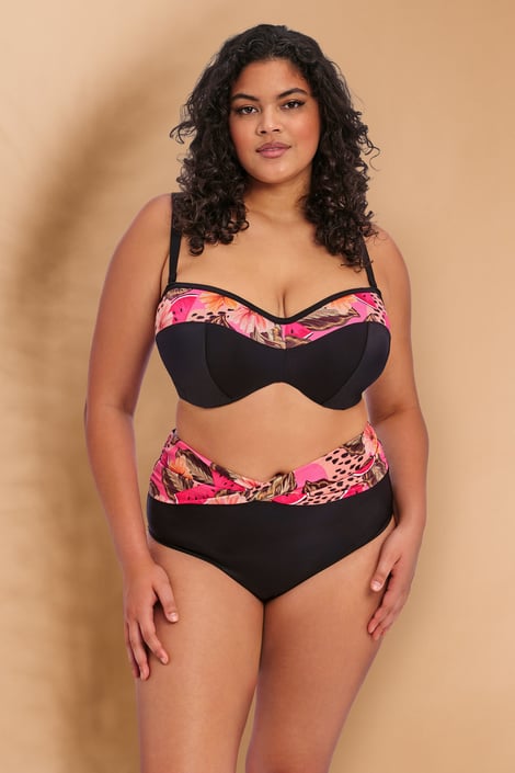 Elomi Cabana Nights bikinifelső, magabiztos bardot szabásban. Egy-egy függőleges varrással készült puha kosarak kissé gömbölyítik a kebleket, magasabb középrésznek köszönhetően pedig stabilan a helyükön maradnak. A melltartó kerülete a jobb tartásért szilikon szegéllyel készült.