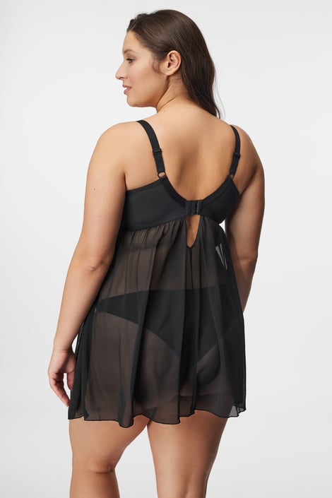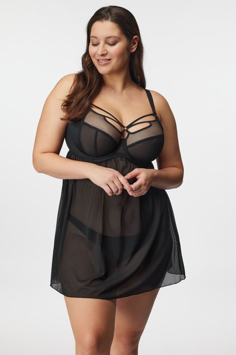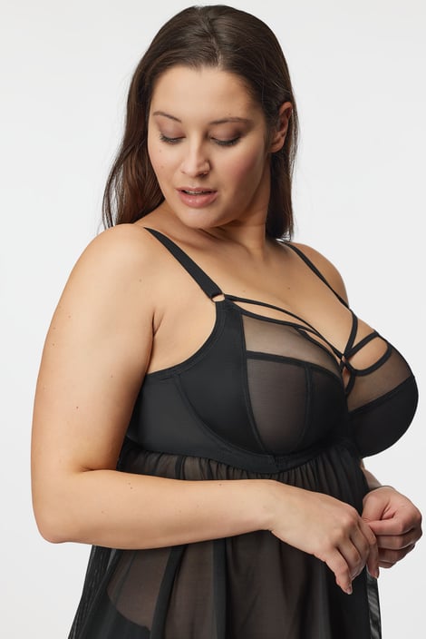 Az Elomi Priya hálóing csábítóan felfedi a teltebb női vonalakat. Az erős hálós anyagból készül bélés nélküli kosarak szép tartást adnak a kebleknek, egy-egy oldalsó támasztó résznek köszönhetően a mellek közelebb kerülnek egymáshoz. Selymes vállpántokkal.
