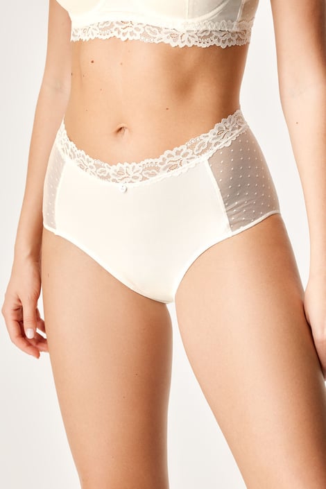 A magasabb fazonban készült Esme női alsó decens pöttyökkel díszíti fel a vonalaidat. Derékrészen puha csipkével.
