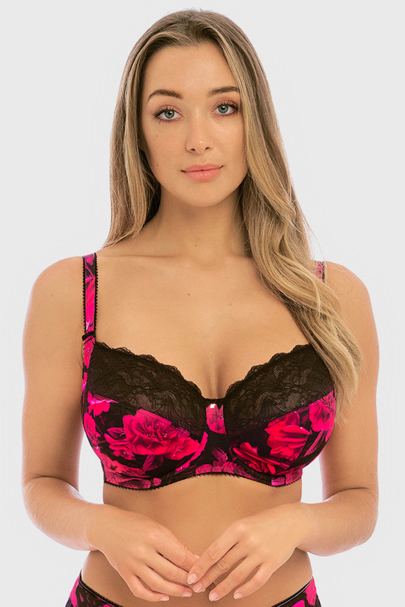 Fantasie Lucia virágmintás melltartó, selymes mikroszálas anyagból. A bélés nélküli kosarak speciális oldalsó támasztó része segít a kebleket közelebb tartani egymáshoz, a magasabb középrész pedig biztosítja a stabil tartást. A kosarak felső része finom csipkével díszített.