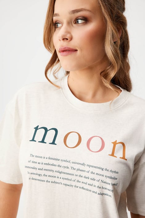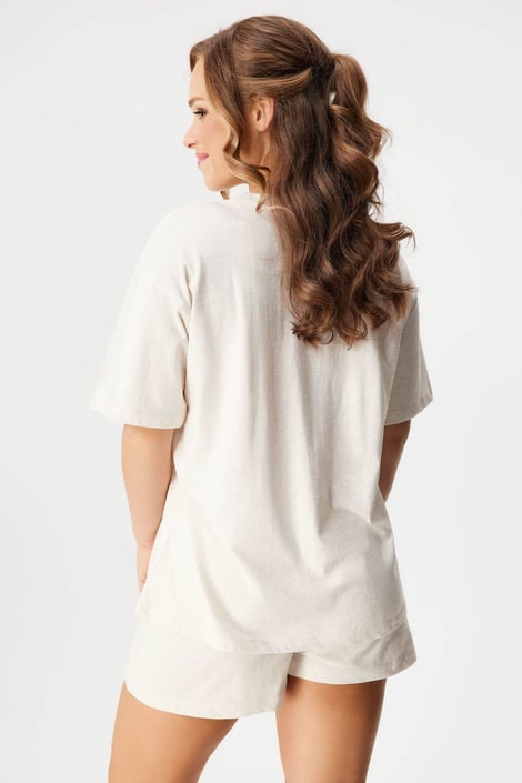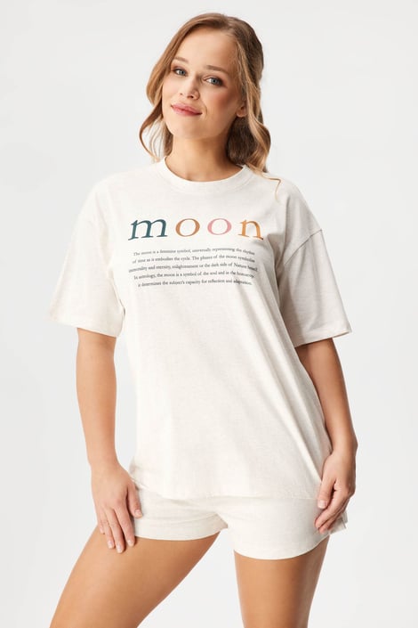 Fune II pizsama sima felületű, melírozott anyagból. A sort derékrészen széles, steppelt gumival készült, a kényelmes póló pedig színes felirattal díszített.