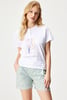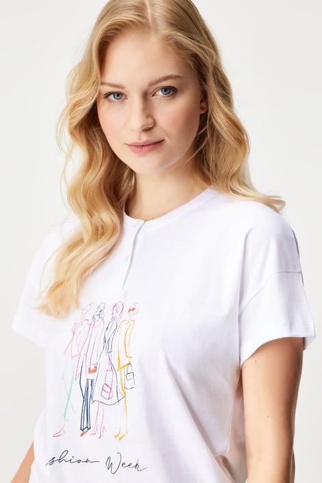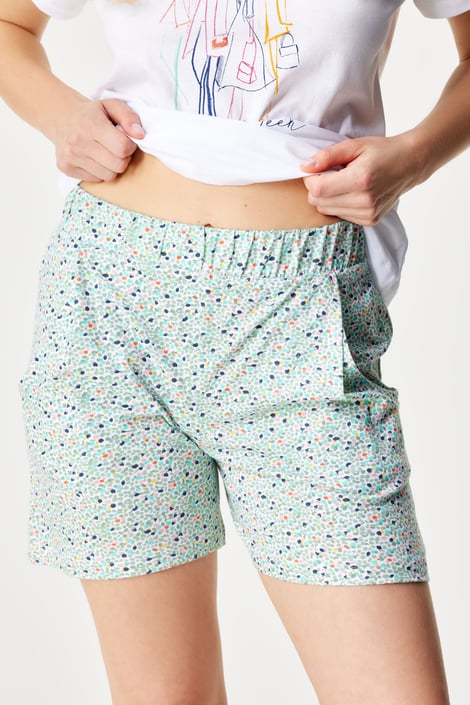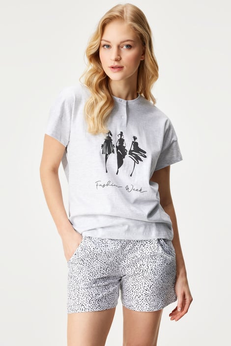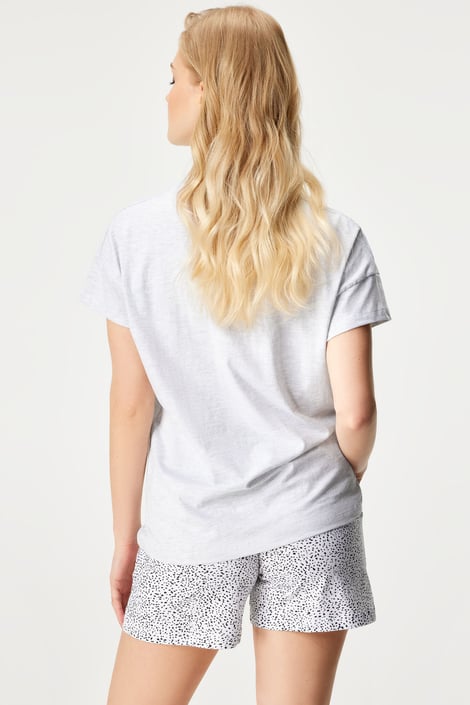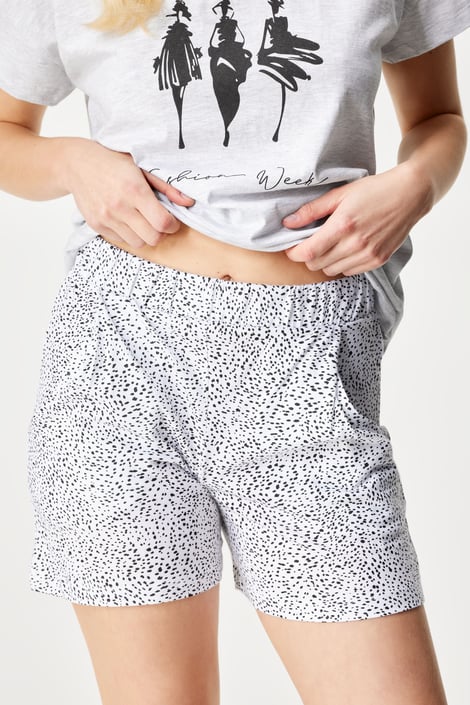 Garofano női pizsama, puha pamut anyagból az éjszakai kényelemért. A póló decens nyomtatott mintával díszített, a sort absztrakt pöttyökkel.