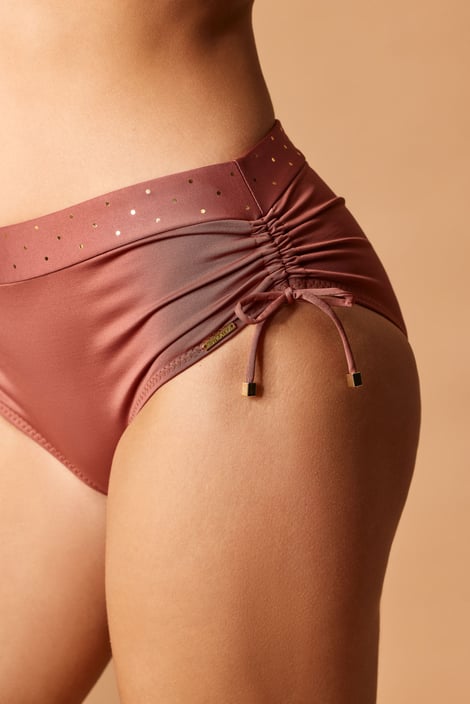 Glitter Brown bikinialsó elegáns bronz színárnyalatban, aranyszínű pöttyökkel. Népszerű klasszikus szabásban készült, oldalt húzózsinórokkal, melyek segítségével könnyen szabályozható a combkivágások magassága. Az Astratex divatműhelyéből.