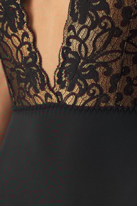 Elegáns szexi body gyönyörű arany-fekete színű csipkéből, megkötős szatén szalaggal. Csak rajtad múlik, hogy esti csábításhoz veszed fel, vagy esetleg merész ruhadarabként egy kigombolt blézer alá.