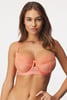 Romantikus Honey Coral melltartó átlátszó tüllből és bájos csipkéből. A nem párnázott kosarak természetes formájukban hagyják, a bevarrt merevítők pedig szépen alátámasztják a melleket. Magasabb középponttal, amit különösen a teltebb keblekkel rendelkező hölgyek értékelnek.