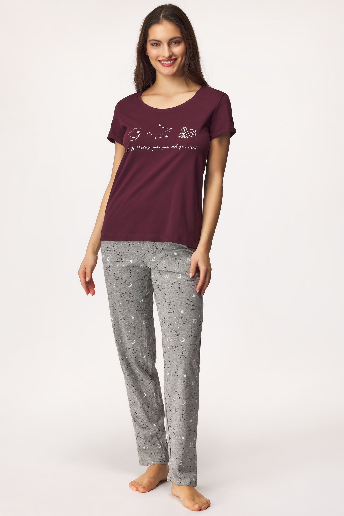 Horoscope II női pizsama pamut és viszkóz kombinációjából. A bordó színű, elöl nyomtatott pólót szürke, csillagokkal díszített nadrág egészíti ki.