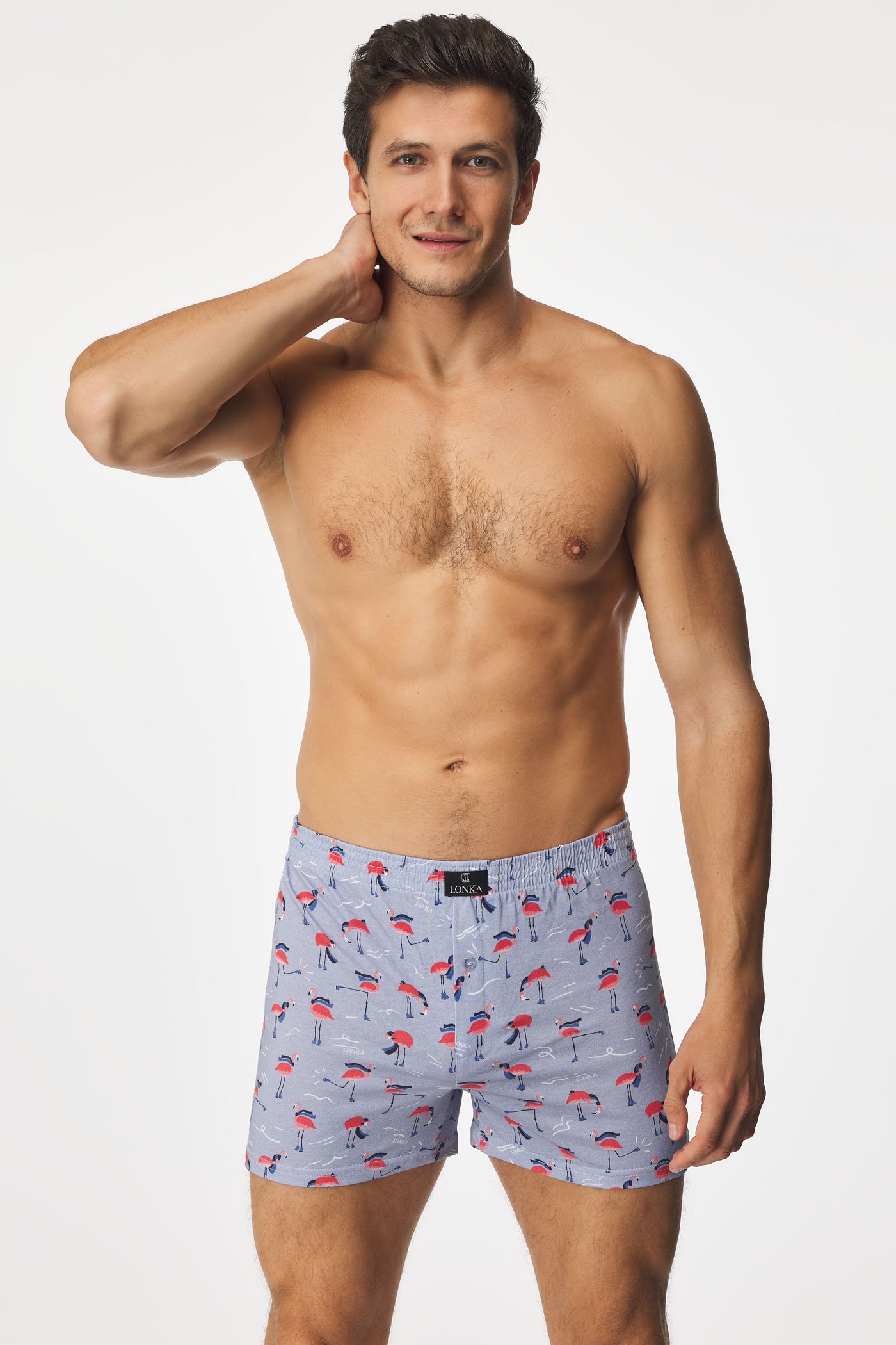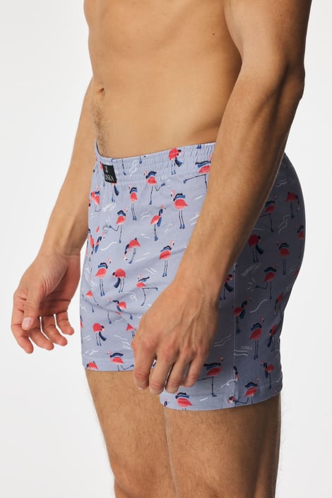 Karlos Flames férfi alsónadrág 100%-os pamutból. A kényelmes anyag egész nap megfelelő komfortot biztosít. Vidám flamingó mintával.