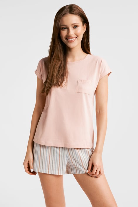 A Lettie női pizsama kellemesebbé teszi az alvást és a hétvégi pihenést is. A 100%-os pamutnak köszönhetően kellemes tapintású és kellemes viselet. A bővebb szabású póló nem túl szoros, a csíkos mintás sort derékrészén steppelt gumi található.