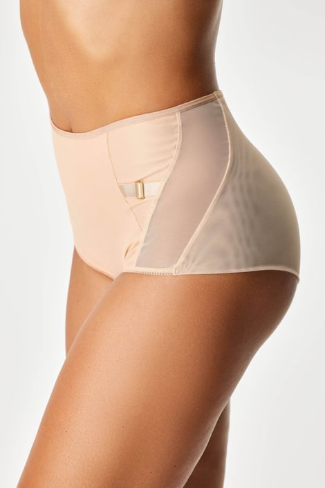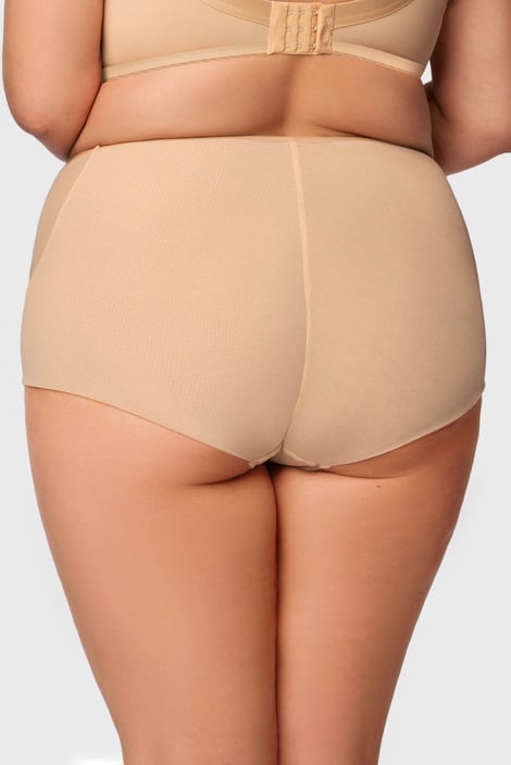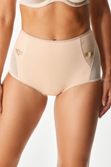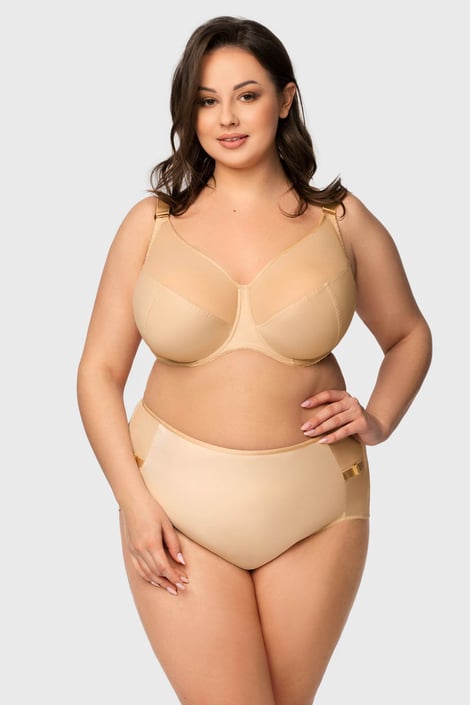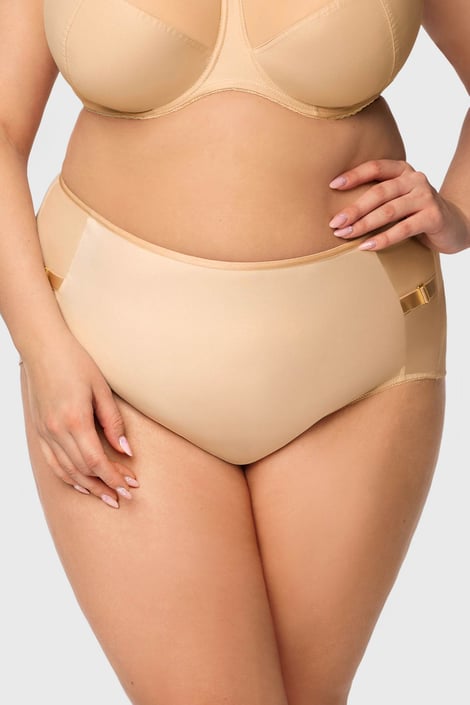 Linda II női alsó klasszikus, magasított szabásban a teltkarcsú hölgyek kényelméért. A sima felületű mikroszálas anyag elülső oldalon aranyszínű részletekkel kiegészített pántokkal díszített, a női alsó hátoldala finom hálós anyagból készült.