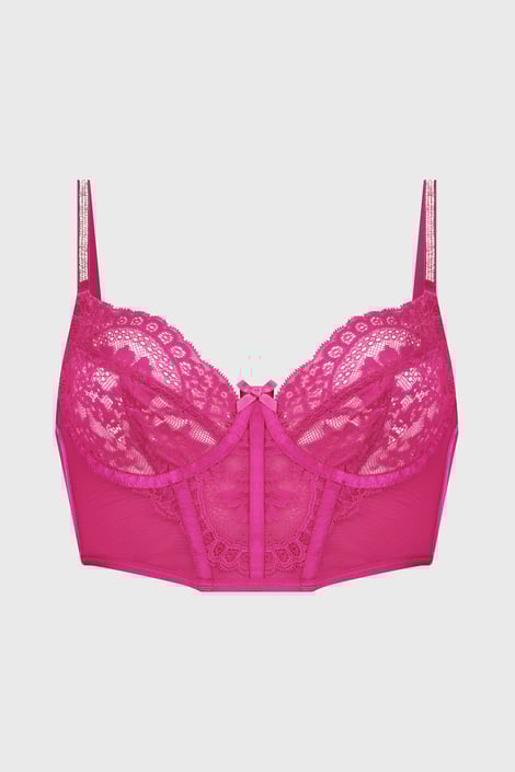 A fűző fazonban készült Lindsey melltartó különlegessége a látványos rózsaszín és a csillogó kövekből álló díszítés. A kosarak áttetsző csipkéből készültek.