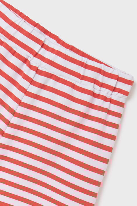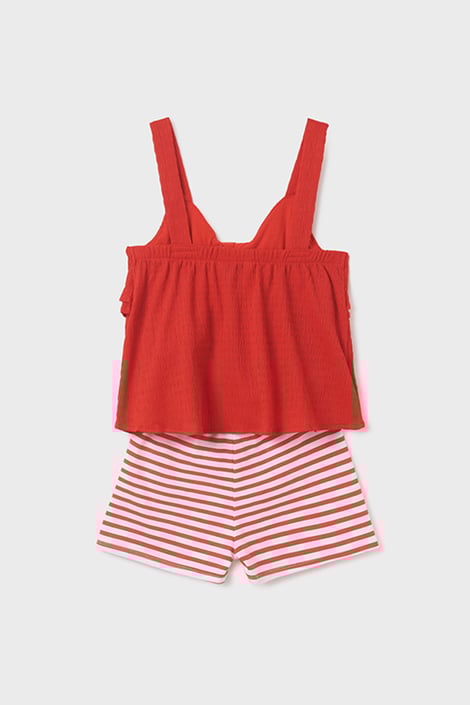 A Mayoral Stripes lány felső és rövidnadrág szett minden kislány számára kötelező darab. A felső enyhén gyűrött, a rövidnadrág pedig kényelmes kötött anyagból készült. Tökéletes darab a meleg nyári napokra.