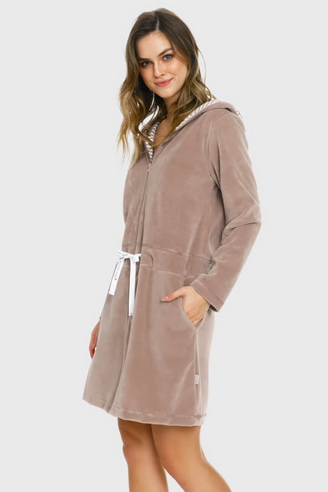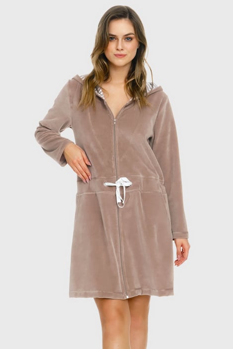 A Meadow kismama köntös a bársonyos anyagának köszönhetően nagyon kellemes viselet. A bővebb szabás megfelelő helyet biztosít a növekvő pocaknak. Praktikus cipzáras záródással és húzózsinórral.