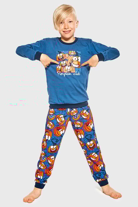 Pumpkin fiú pizsama 100% pamutból. A hosszú ujjú póló és a hosszú nadrág tökös mintával díszített.