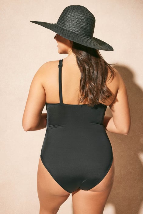 A Shibori egyrészes fürdőruha dizájnjával a teltkarcsú alkatúak számára is alkalmas. A fekete rész optikailag karcsúsítja a testet, a nyomtatott rész pedig látványos keresztezéssel hívja fel a figyelmet a mély dekoltázsra. A rejtett kosarai kivehető párnázást tartalmaznak, a pántjainak hossza pedig állítható. A bugyirész klasszikus szabása tökéletesen körülöleli a feneket.
