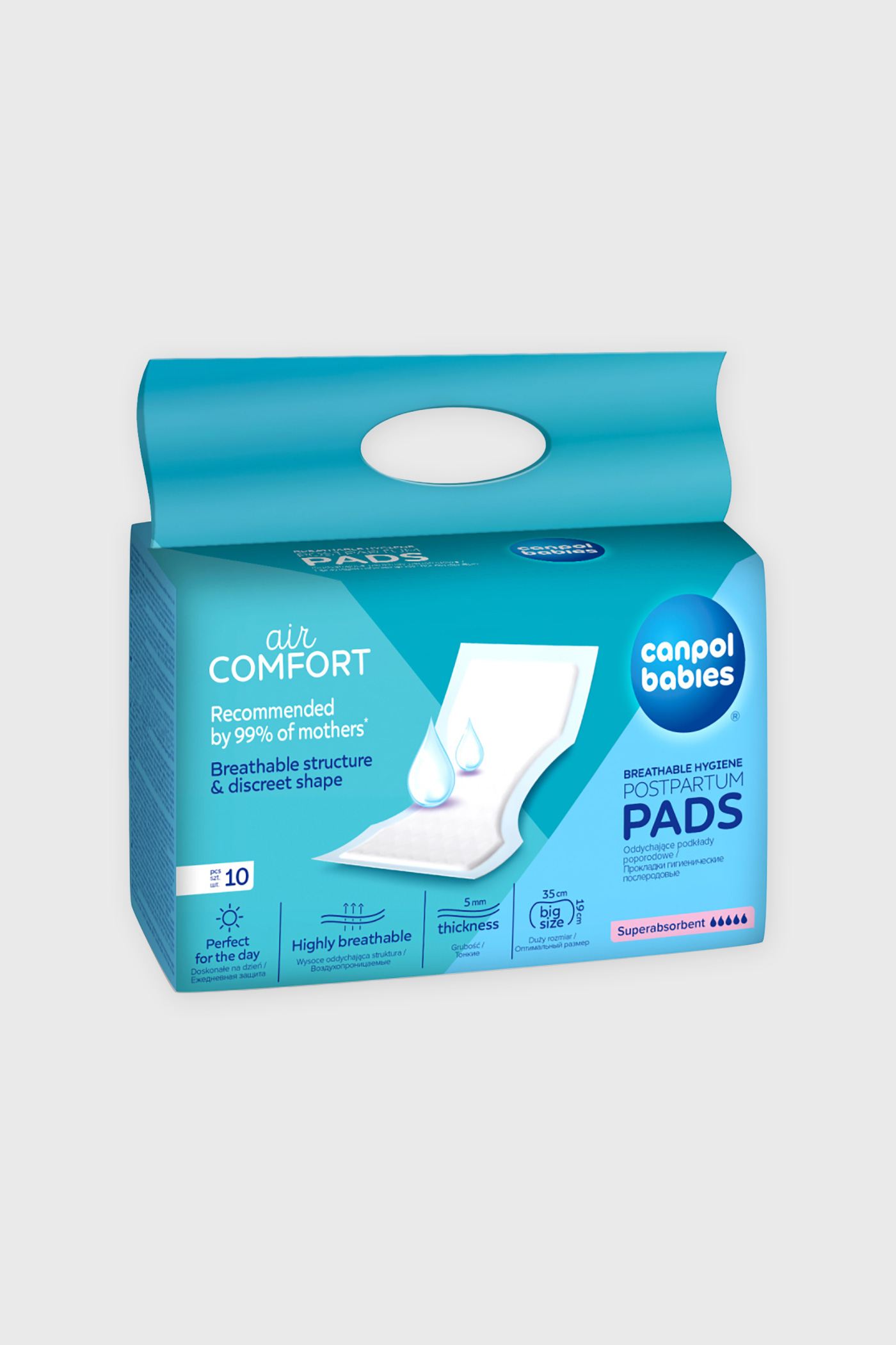 Higiénikus, szülés utáni betét – szuper abszorpciós! Tíz darab egy csomagban. A széles profilos forma és a vékony anyag fekvő helyzetben is tökéletes védelmet biztosít.