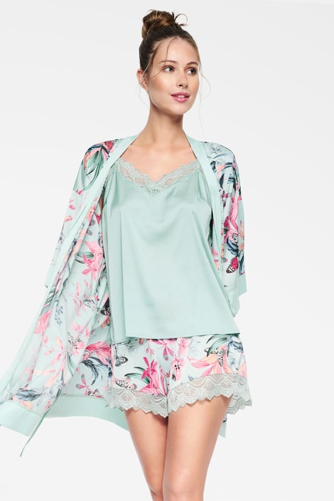 A könnyű Wisteria pizsama tökéletes a forró nyári éjszakákra. A puha szatén lágyan a testhez simul és kellemesen hűsít. A lágy mentaszínű felső nyakát csipke díszíti, míg a rövidnadrág virágmotívumokkal tarkított.